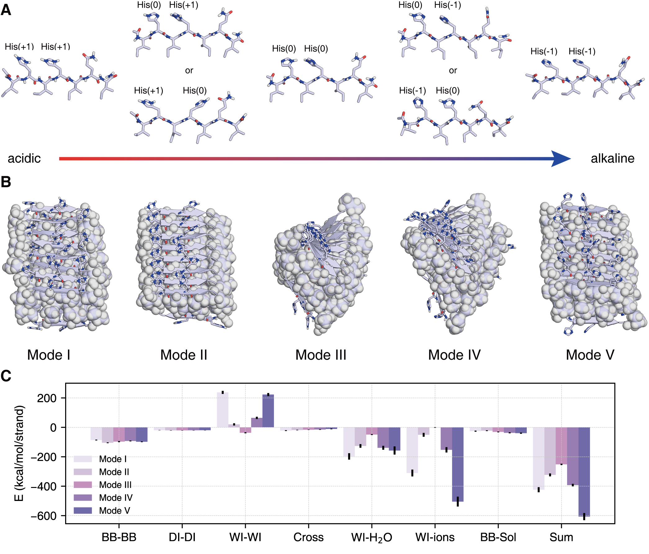 图1. 计算预测不同pH条件下多肽具有不同的自组装结构和相互作用模式