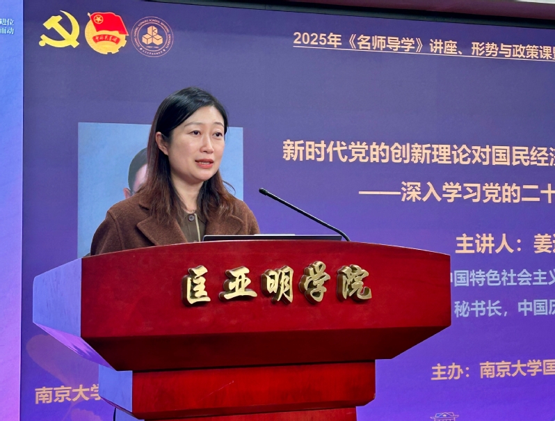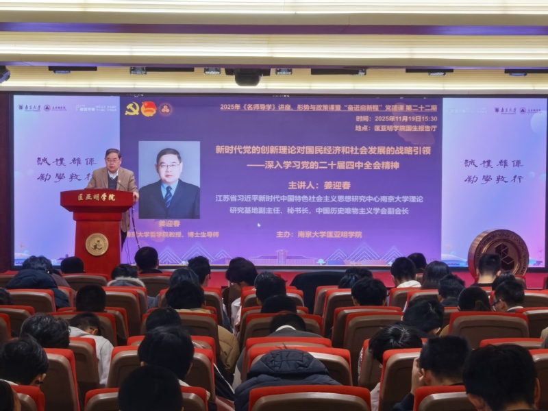 11月19日,成人ai 举办“奋进启新程”党团课暨《名师导学》课程,专题学习党的二十届四中全会精神。江苏省习近平新时代中国特色社会主义思想研究中心成人ai 理论研究基地副主任、中国历史唯物主义学会副会长、哲学学院教授姜迎春做题为“新时代党的创新理论对国民经济和社会发展的战略引领——深入学习党的二十届四中全会精神”的专题报告。成人ai 党委副书记周安、副院长董昊、院长助理胡晶磊,师生党团员代表,课程学员200余人参加。课程由成人ai 党委书记周媛主持。