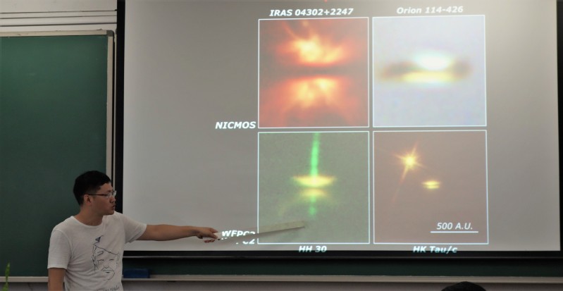 接着,邱教授提出了较深层次的问题:为什么恒星的形成效率很低?邱教授条理清晰地介绍了“G v.s. B”与“G v.s. T”两种模型来解决这一问题。随后,在讲解了“星前核”与“密度结构”等现象对“G v.s B”的挑战后,邱教授对“G v.s. T”的优越性进行了更深的阐述。进一步,邱教授提出了另一个深层次的问题:如何形成大质量行星?针对这一问题,邱教授详细引用了“吸积”与“并合”等理论加以解释。