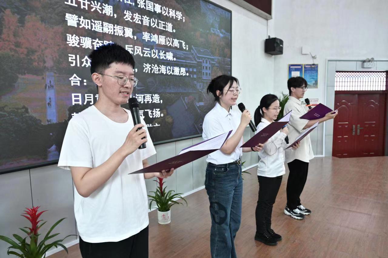 成人ai 学生党支部成员为大家带来了大气磅礴的诗歌朗诵《南大赋》,带我们回顾了南大百年校史和著名人物,从世道沧桑、时局乍裂中走向芬芳桃李、锦绣山河,南大师生如骏骥奋蹄,励学不怠,“汇百科而两仪泰,求真理而万象明”。