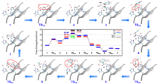 研究发现,两亲的多肽链在溶剂中通过氢键和范德华力及疏水作用,自发形成类似磷脂双分子层的有序结构。改变多肽链的氨基酸序列可以显著改变聚集体的形貌。相邻的多肽链形成的β片结构会呈现平行或反平行的不同排列,整体的纤维结构也会呈现不同程度的扭曲。通过比较体系氢键数量、扭转角度、溶液可接触面积等特征参数发现,相比于“平整”结构,“扭曲”结构能够更好的兼顾“刚性”与“柔性”。这种动态平衡既充分保证自组装结构的稳定性,同时又使得催化所需的金属离子结合在自组装结构表面形成的反应活性中心时能够形成最优的配位结构,从而高效的实现催化功能。高精度量子力学计算的反应路径表明,“扭曲”结构经历的反应能垒低于“平整”结构的值,说明结构的微观差异是影响催化反应的重要因素。通过对四百余个碳酸酐酶晶体结构的分析发现,天然酶的活性中心具有类似的“扭曲”结构,进一步说明对于天然酶活性中心微环境的模仿是提高仿酶活性的关键参数。因此,本研究从原子层面理解了多肽自组装体的结构与机制,将特殊的微观结构与宏观性质联系起来,为设计具有更高催化活性及更广泛催化能力的功能性生物材料提供了理论指导和依据。理论计算提出的结构模型得到了固体核磁等多种实验表征手段的验证,充分说明多尺度模拟手段研究复杂体系具有较好的准确性和预测性。此外,该工作对脑科学相关的脑疾病机理研究具有基础性作用。