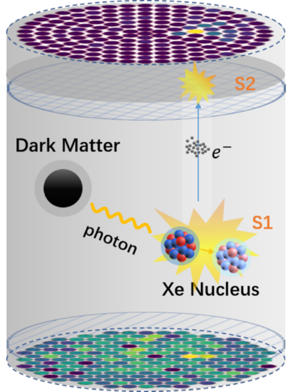 2009年起,PandaX合作组利用锦屏地下实验室极低辐射本底环境,研制了三代液氙探测器(PandaX-I、PandaX-II、PandaX-4T),并开展了一系列针对暗物质和中微子的实验研究。宇宙中的暗物质可以穿透地球到达地下实验室,如果暗物质和普通物质间有相互作用,会同探测器中的氙原子碰撞并产生反冲信号,在探测器中以氙原子闪光(S1)和电离(S2)的形式表现出来。探测器的工作原理如下图所示。
