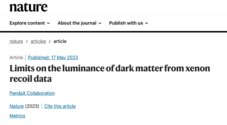 近日,上海交通大学牵头的PandaX合作组在深度分析新一代PandaX-4T液氙探测实验数据后,对暗物质可能具有的电磁性质给出了国际最好的测量结果。该成果以“从氙反冲数据得出的暗物质的亮度极限”(Limits on the luminance of dark matter from xenon recoil data)为题,于2023年5月17日《自然》(nature)期刊上在线发表。