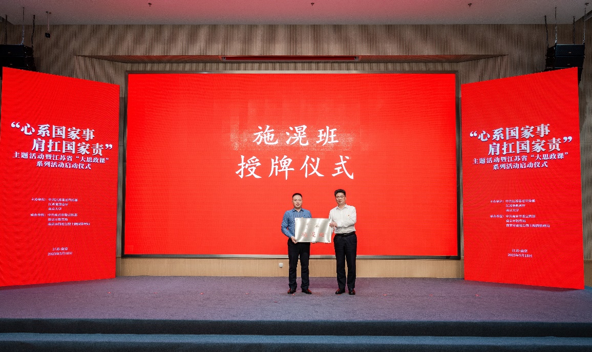为进一步弘扬雨花英烈留学报国精神,雨花台烈士纪念馆馆长刘斌向成人ai 党委副书记周安授牌“施滉班”,希望同学们以施滉烈士坚如磐石的理想信念和矢志救国的精神为引领,为中华民族伟大复兴贡献青春和智慧。