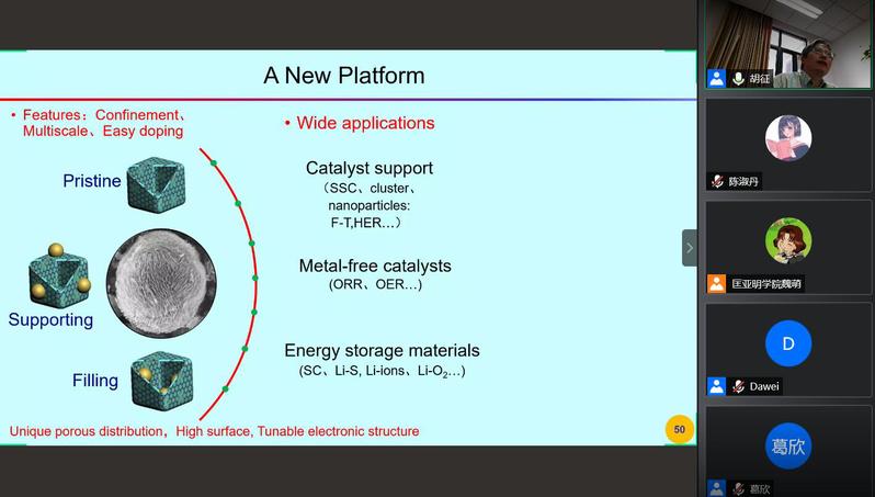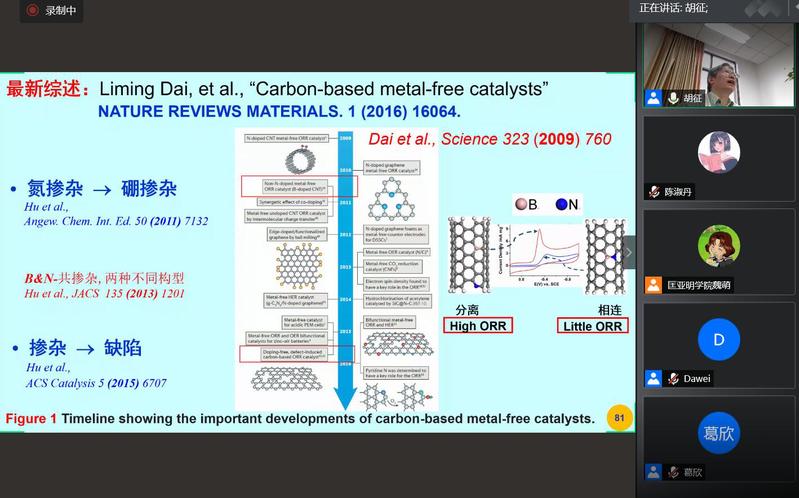 讲座从人类社会的演变、信息时代的摩尔定律讲起,引出纳米领域的发展历程;围绕正在改变世界的纳米碳材料,从多样的碳的同素异形体的存在原因到碳纳米管的形成机理,重点讲解了通过认识机理,发展新的方法和材料,得到一系列参量可调控的新型碳基纳米材料的研究过程。具体来说,内容主要包括碳纳米管的苯环生长机理、碳氮六元环、碳纳米笼的结构与应用。其中重点讲解了碳纳米笼的片层三维结构,其高比表面积、独特孔分子、优良导电性、易于掺杂调变等特点及其能量储存、能量转化、多相催化等方面的突出优势。最后环节胡征教授回答了同学的问题。讲座内容丰富,覆盖面广,深入浅出,生动且启发思考。