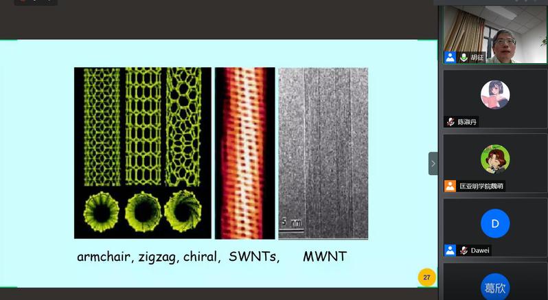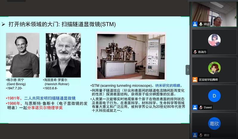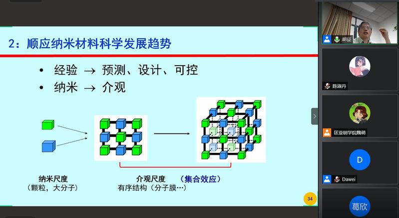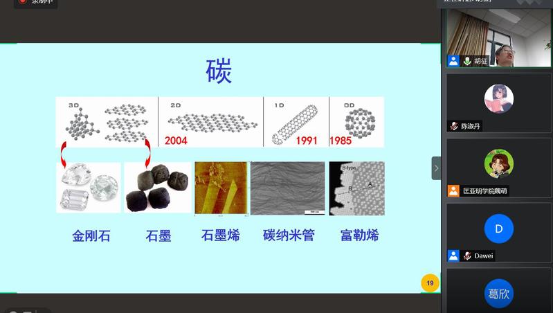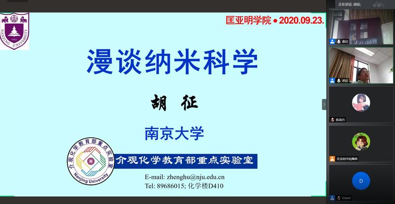 9月23日下午,介观化学重点实验室的胡征教授给成人ai 的同学带来以“漫谈纳米科学”为主题的线上名师讲座。围绕纳米材料发展进程,介绍了他和研究团队在纳米碳材料领域做出的创新型工作;通过具体的例子和心路历程,让同学们认识纳米材料,感受科研的思维、方法、精神及其与科学知识的联系。