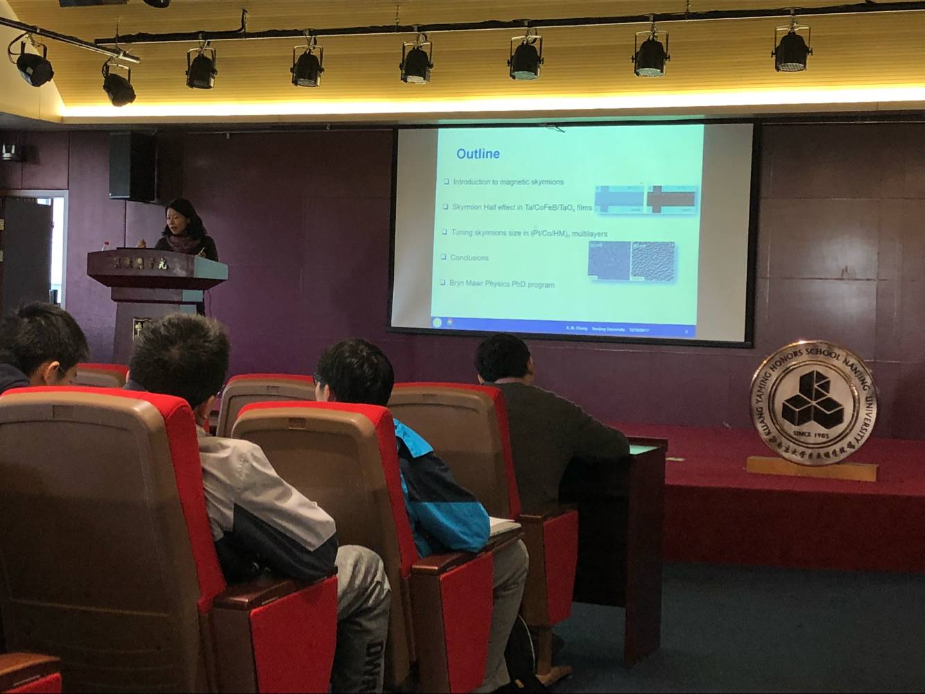 12月20日下午,来自美国布林茅尔学院的程雪梅教授在潘琦楼国生报告厅为来自匡院和各个拔尖班的近两百位2016级同学开展了一场生动有趣而又干货满满的讲座。作为美国布林茅尔学院物理系主任,程教授用简单易懂的描述和特意购置的用作展示道具的橡皮泥,向大家介绍了拓扑学的基本知识和磁斯格明子(magnetic skyrmions)这一研究领域的全貌,使刚刚进入大二的同学们对凝聚态物理的前沿领域产生了初步的了解。