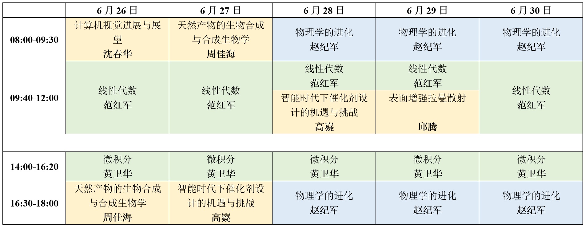 6月28日(周三)下午,《微积分》课程 13:40-16:00,《物理学的进化》课程 14:30-16:00