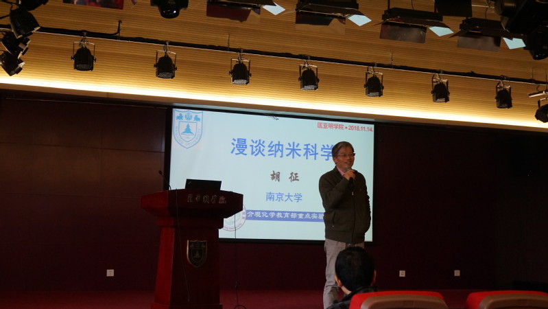 11月14日下午两点,17级成人ai 理科强化班以及相关院系部分拔尖计划的同学们在国生报告厅倾听了成人ai 化学化工学院胡征教授题为“漫谈纳米科学”的讲座。胡征老师是成人ai 化学化工学院的教授、博士生导师、国家杰出青年基金获得者,教育部长江学者特聘教授。胡征教授的主要研究领域为纳米结构新材料。讲座由成人ai 吴盛俊教授主持。