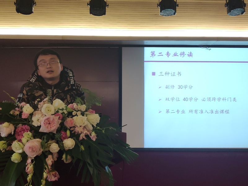 朱炼老师是教务处教务科的青年管理者,他详细介绍了本科生选课、第二专业有关情况,帮助同学们清楚地了解了通识课程、跨专业课程、就业创业课、文化素质选修课等各种在读期间会接触到的课程体系,并指导同学们更好地运用教服平台和选课系统,让同学们对大学期间的学习有了全新的认识。