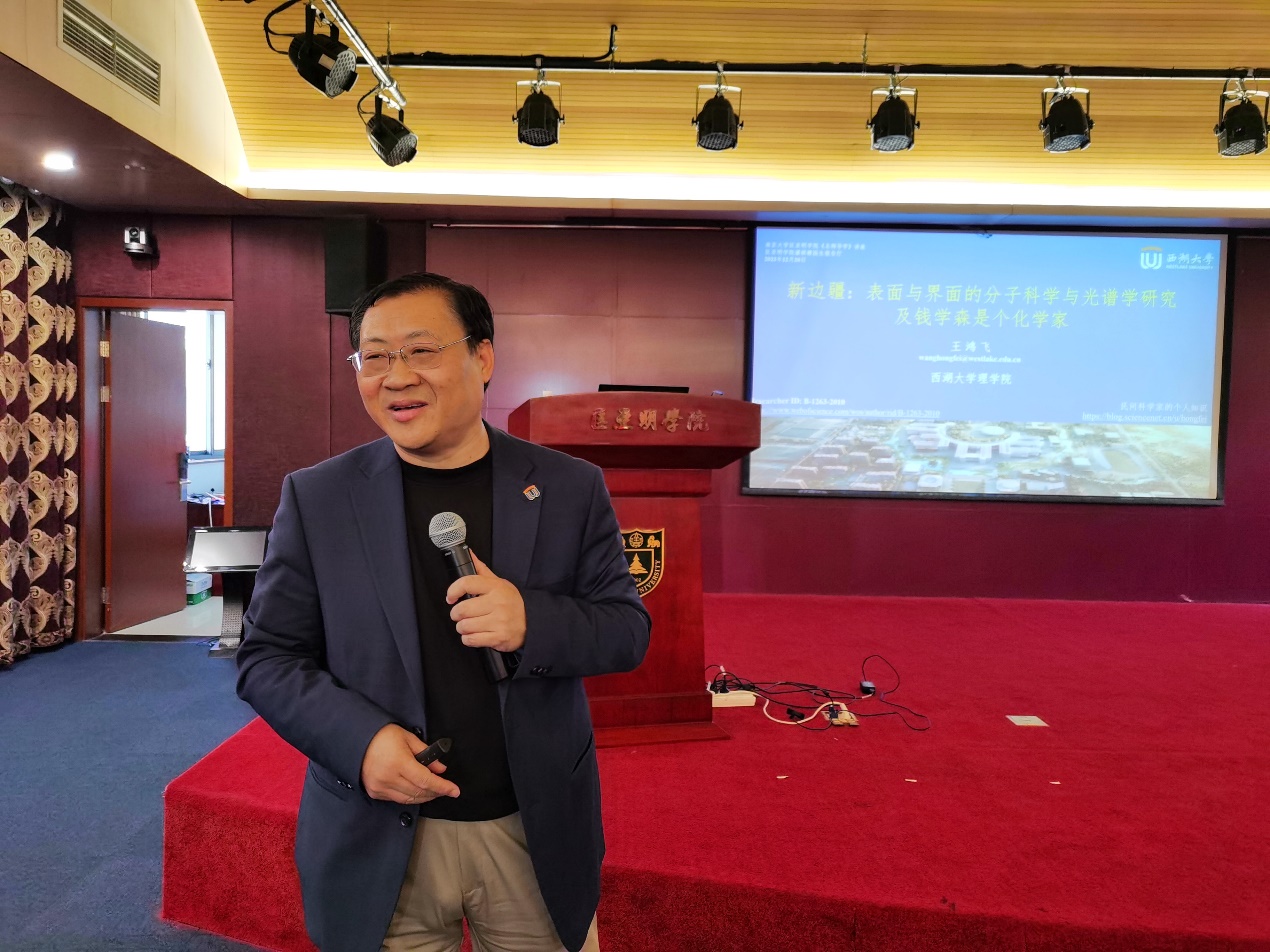 2023年12月20日下午,《名师导学》课程系列讲座第十讲在学院国生厅如期举行。本次讲座邀请到西湖大学理学院化学与物理教授王鸿飞老师。王教授先后入选美国物理学会会士、中国科学院百人计划、基金委杰青、上海市第六批“海外高层次人才”专家、中组部第十四批“海外高层次人才”专家。讲座题目为《新边疆:表面与界面的分子科学与光谱学研究及钱学森是个化学家》。