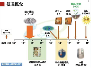 尤立星老师首先以低温下的一些产品距离,如冰激凌和冰啤酒,之后讲到较低的温度不仅仅可以制作人们喜爱的食品,在科学研究领域,低温也是相当重要的实验环境。从6000K的太阳表面温度,到几百K的人类体温,再到4K的重要战略资源液氦,其中以液氦为临界定义的高温超导和低温超导在现代科学中有些十分重要的应用,在量子领域,实现量子计算更需要约10mK这样的超低温来提供实验环境。