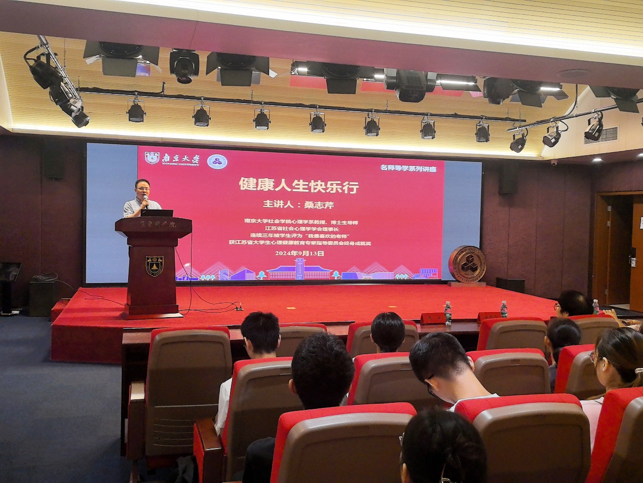 2024年9月13日晚上,成人ai 新生入学教育暨“寻根科研路,传承报国情”第一期主题党团课在仙林校区潘琦楼成功举办。本次活动邀请了成人ai 社会学院心理学系教授、博士生导师、江苏省社会心理学学会理事长桑志芹教授做题为“健康人生快乐行”主题讲座,学生党支部书记司林敏,辅导员赵玉倩、陈丹以及学生党支部、2023级本科生、2024级研究生。讲座由成人ai 党委副书记周安主持。