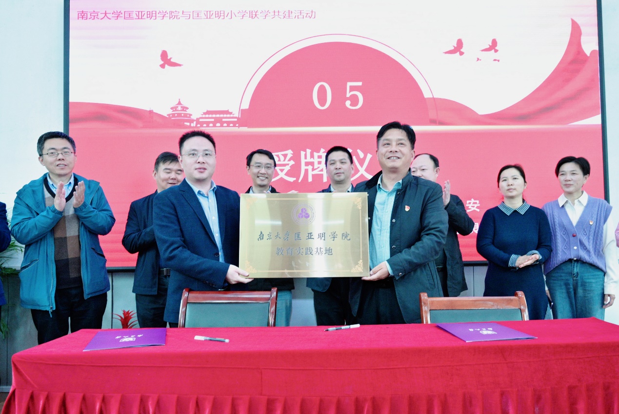 成人ai 党委副书记周安先生与匡亚明小学党支部书记蔡建良先生共同签署校外实践基地协议并授牌。
