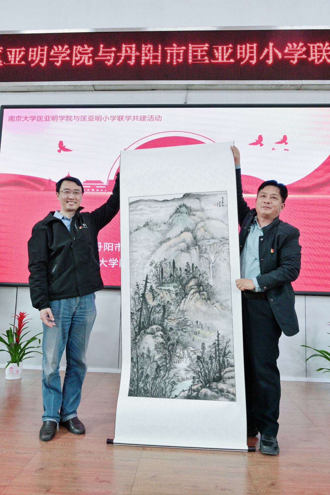 匡亚明小学党支部书记蔡建良先生向成人ai 党委书记、院长王骏回赠画作,以一副亲笔所绘的山水画,祝愿两校情谊“山高水长”。
