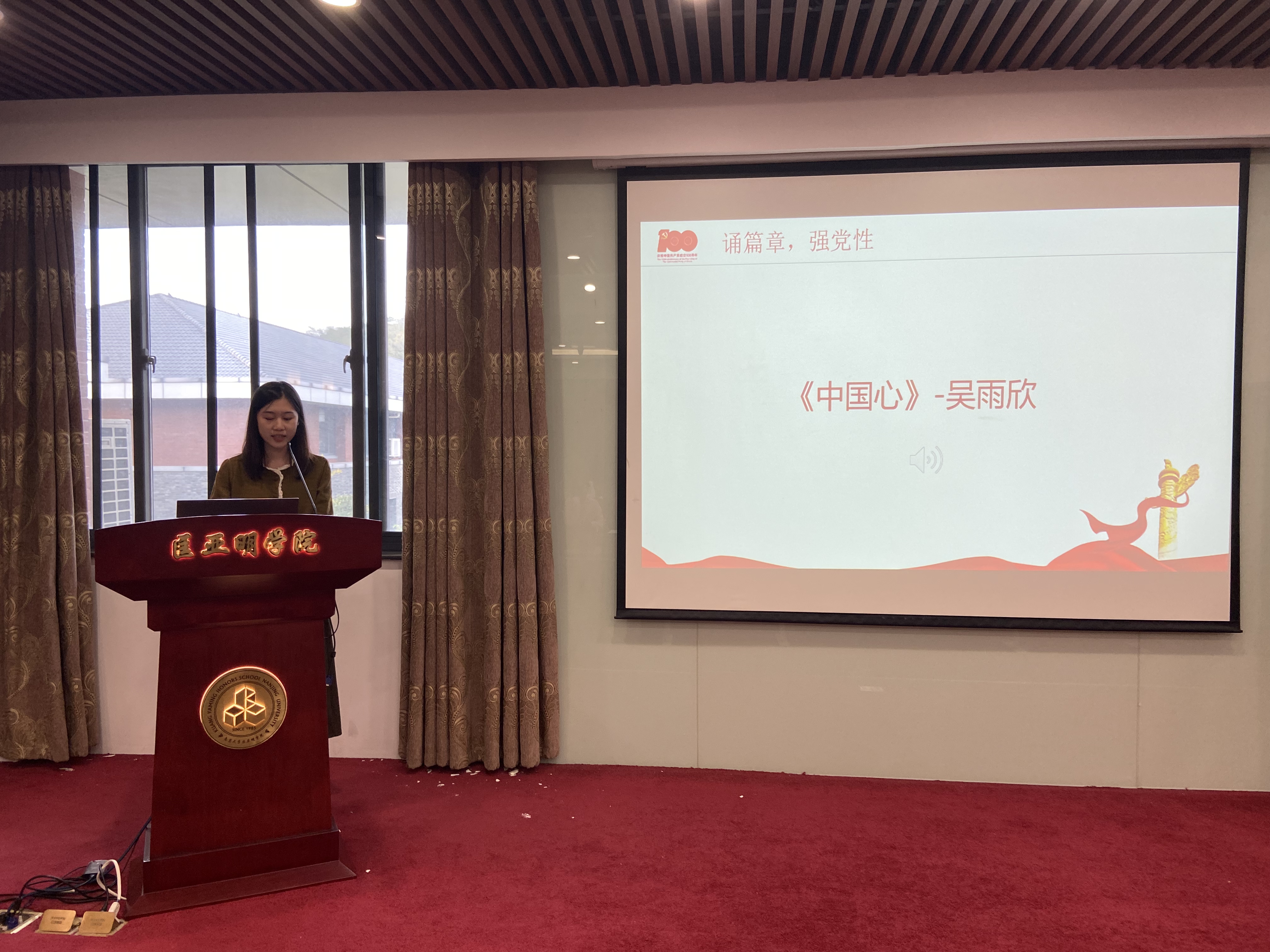 匡院学子以踔厉奋发之姿,以斗志昂扬之貌歌颂二十大。吴雨欣同志诵读的《中国心》从各行各业的角度出发,描绘一代代共产党人为国捐躯、努力奋斗的故事,展现了中国人民的赤诚之心;顾睿同志朗读的《秋风里的中国》展现了秋日下祖国繁荣昌盛、一篇祥和的景象,歌颂了党的十八大以来中国所发生的巨大变化,从中可一窥大时代的万千气象;桂晨同志朗诵的《月光下的中国》诗句优美,意境深远,对国家发展简略而有节概括,展现了月光下一个宁静、温柔、祥和、美丽的中国。徐冲同志诵读的《美丽中国梦》描绘了国强民富的美好愿景和中华民族伟大复兴的美丽中国梦,为中国走向繁荣昌盛倡导精神力量,为实现中华民族伟大复兴呐喊。吴辰华同志朗诵的《党的二十大之歌》,让我们再次感受到一个伟大的政党,满怀信心、笃行不怠,再次从春天启程,决胜第二个百年奋斗目标。任双龙同志朗诵的《诗意中国》,展现了国家自信昂扬的诗意,带着华夏儿女走向中华民族伟大复兴的决心。匡院学子以青春之名,歌颂二十大,进一步巩固学生党员们的理想信念根基,增强党性修养,强化政治意识,砥砺初心,勇攀高峰,担负起时代重任。